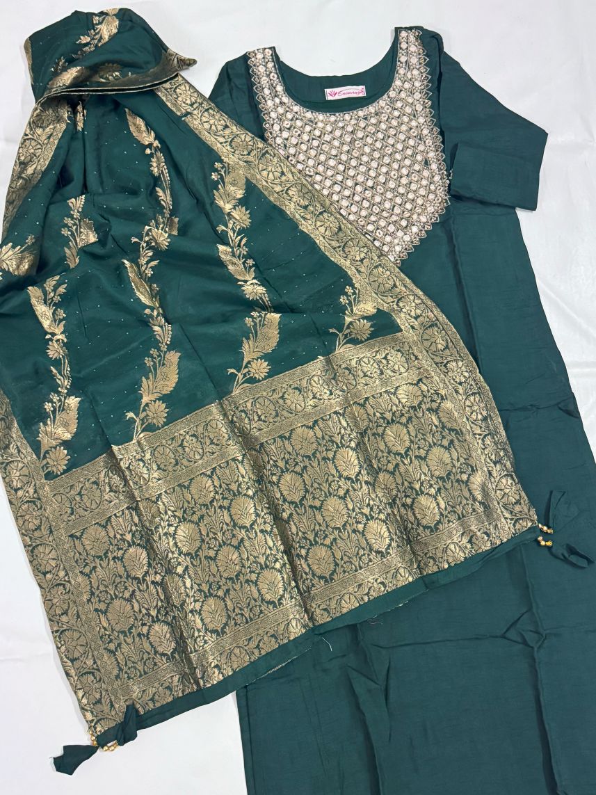 The rich dark green hue adds regal depth, while the matching pant and dupatta complete the graceful ensemble. Ideal for festivals, weddings, sangeet nights, parties, and cultural gatherings, this outfit is designed to make you stand out with effortless sophistication.