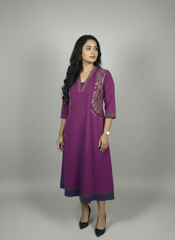 This handloom cotton A-line midi dress in a rich purple hue showcases timeless elegance with intricate thread embroidery on the yoke and sleeves. Designed with a flattering V-neckline and refined panel detailing, the dress offers a graceful silhouette. A contrasting border at the hem adds a polished, classy finish.
