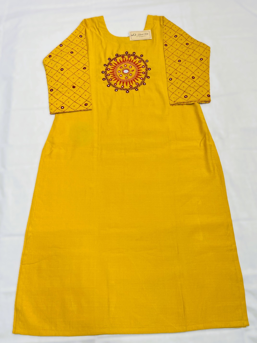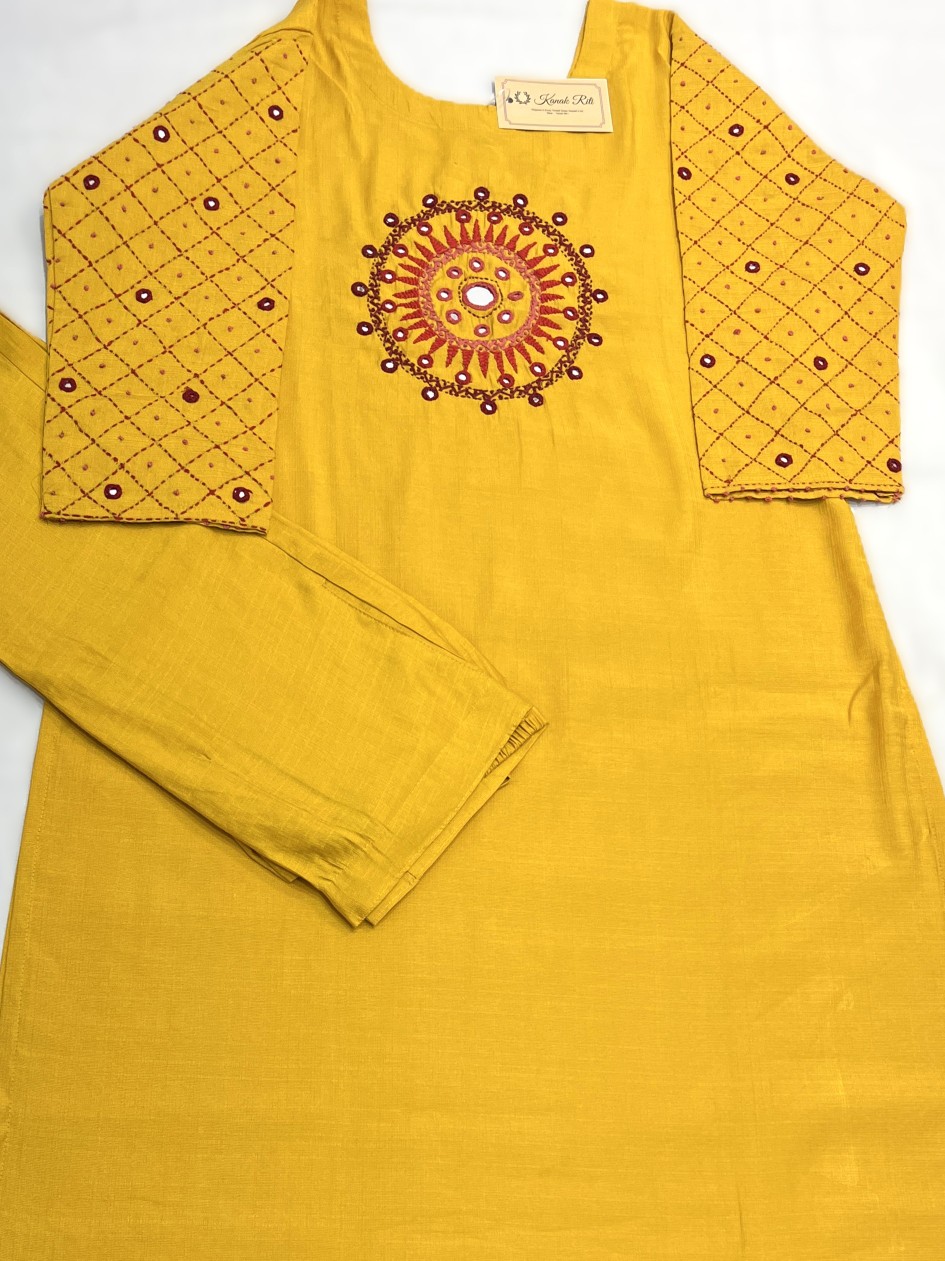 🧵 Work: Hand embroidery yellow cotton kurti