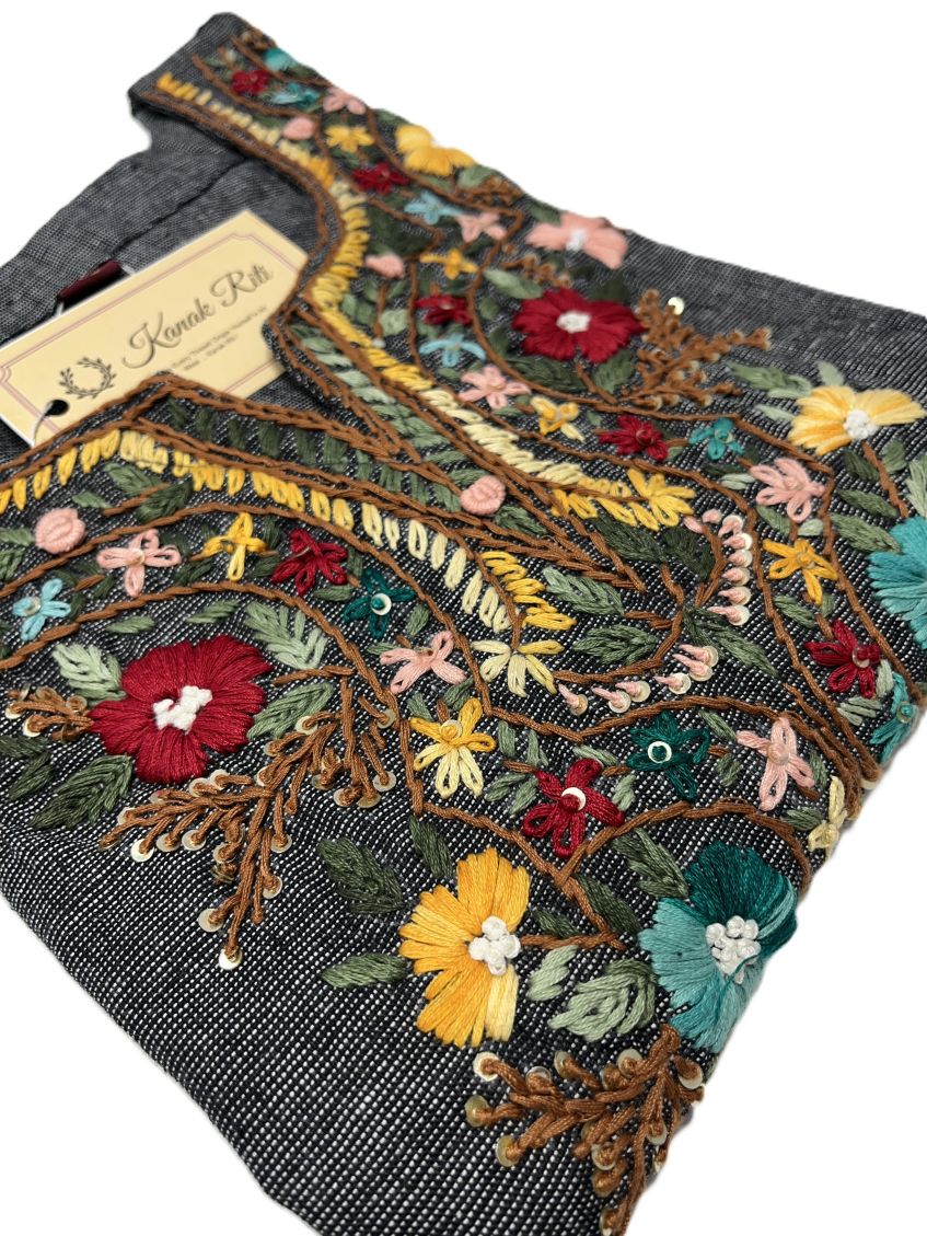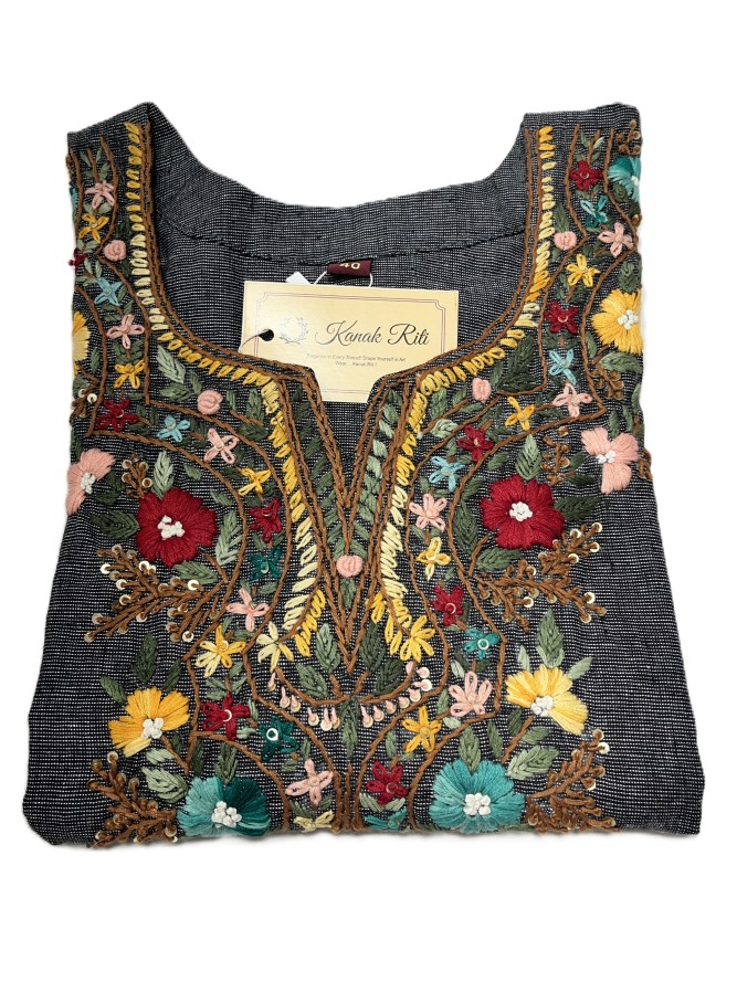 Elegant linen kurti featuring handcrafted multicolor floral thread embroidery. Made from breathable linen fabric, this kurti offers comfort and rich ethnic appeal. Perfect for festive wear, office wear, and casual outings with a timeless handcrafted look.