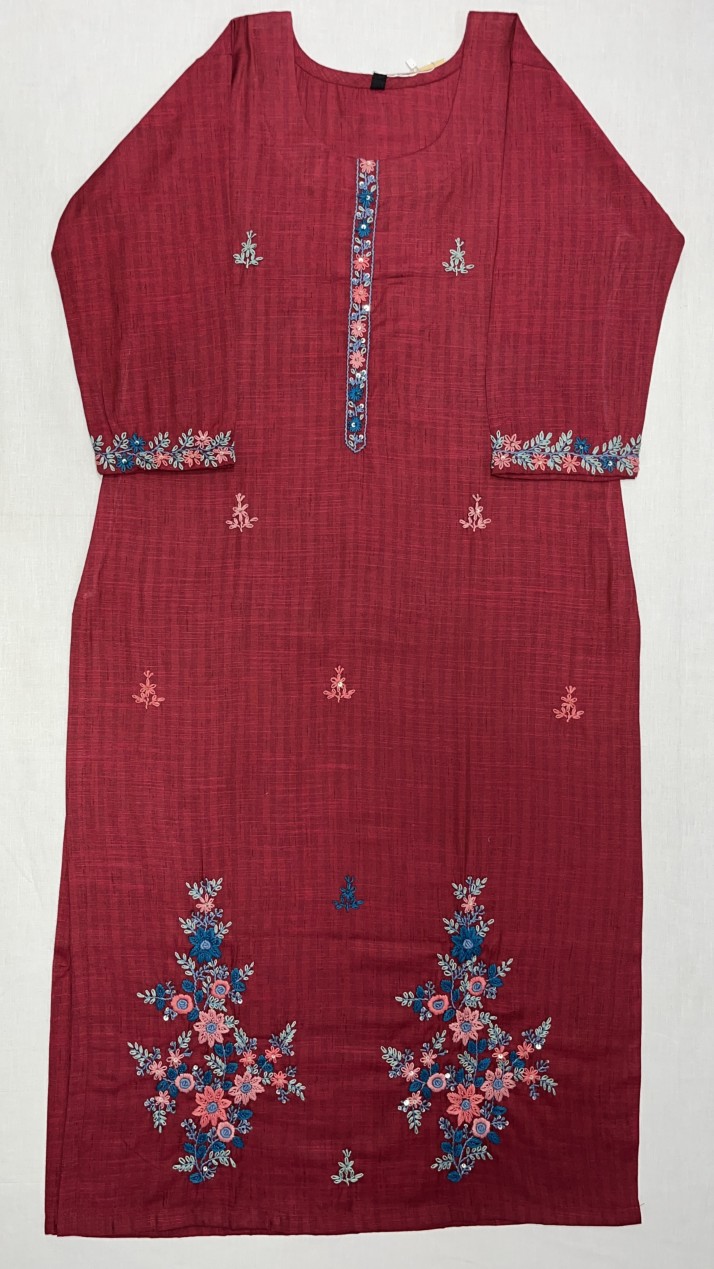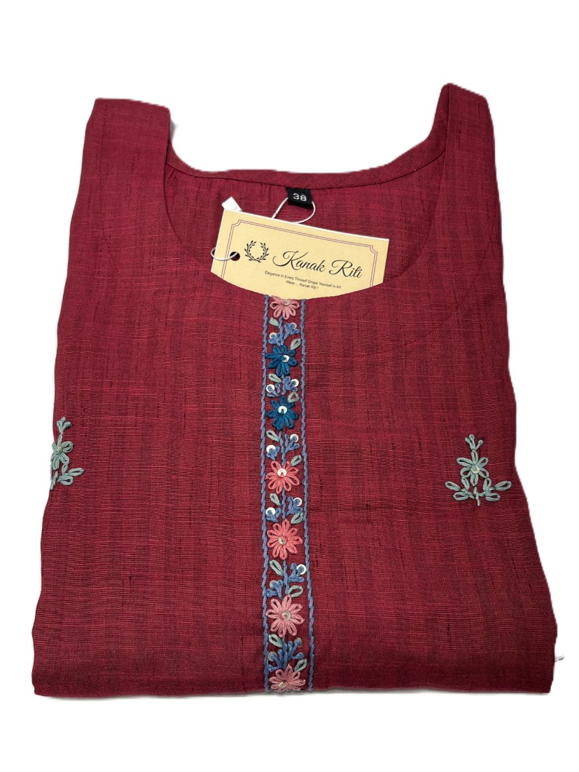 Rani pink cotton blend kurti featuring elegant multicolor resham thread floral embroidery with vertical panel design. Soft, breathable and comfortable fabric perfect for office wear, daily wear and casual ethnic styling.