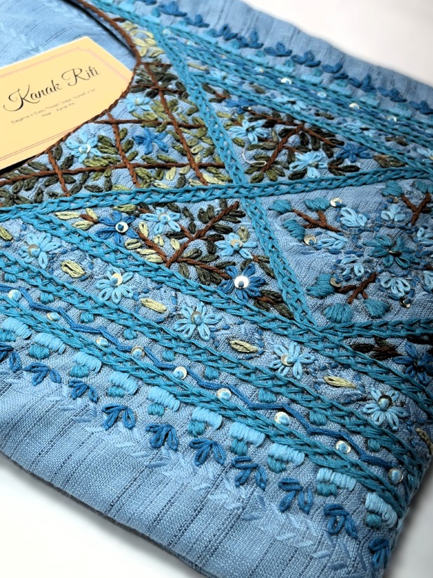 🧵 Work: Heavy thread embroidery with floral and geometric panel design on front.