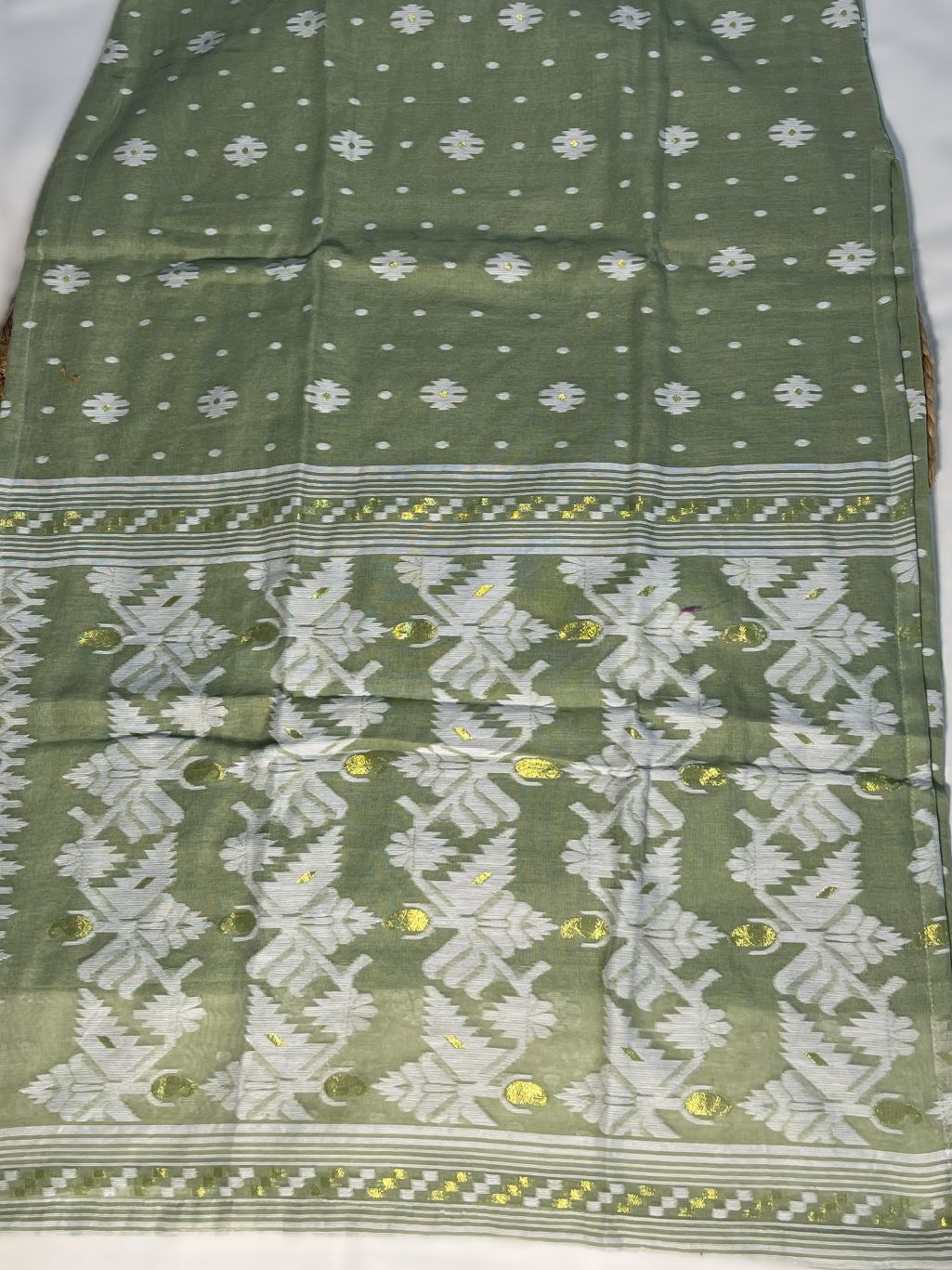 🌿 Soft pastel green Jamdani fabric with a lightweight, airy feel