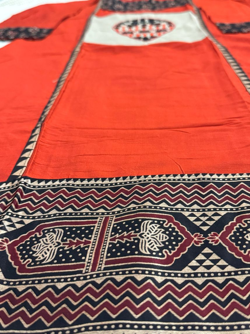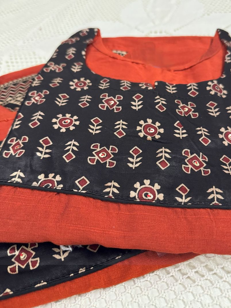 Be the first to review “Rust Orange Raw Silk Kurti with Mirror Work & Hand Stitch”