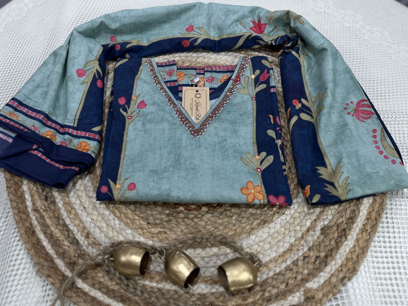 Be the first to review “Cotton Teal Blue & Navy Floral Kurti Set with Dupatta”